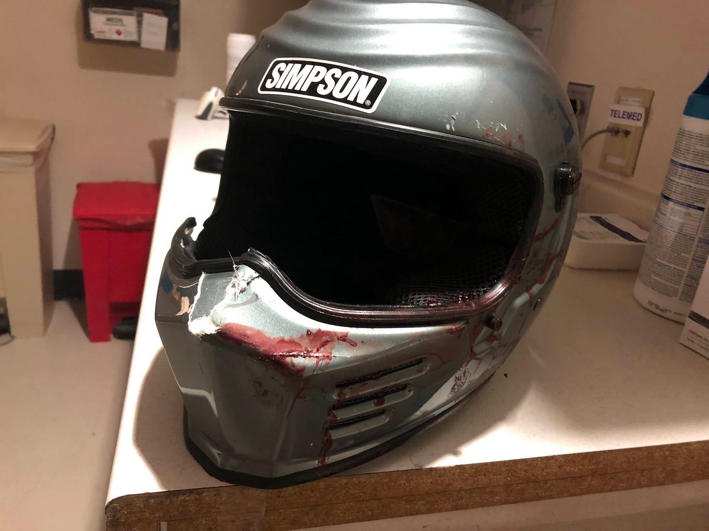 When we finally got back to his bay, I peeked in. He was strapped to a stretcher, quiet, but with 5 people buzzing about him. I scanned the room and saw his helmet on the counter, cracked vertically across his mouth guard and covered in blood. His clothes were crammed in to a bag on the floor and you could see the blood splatter on the inside of the plastic. I slowly crept to his side and looked down.